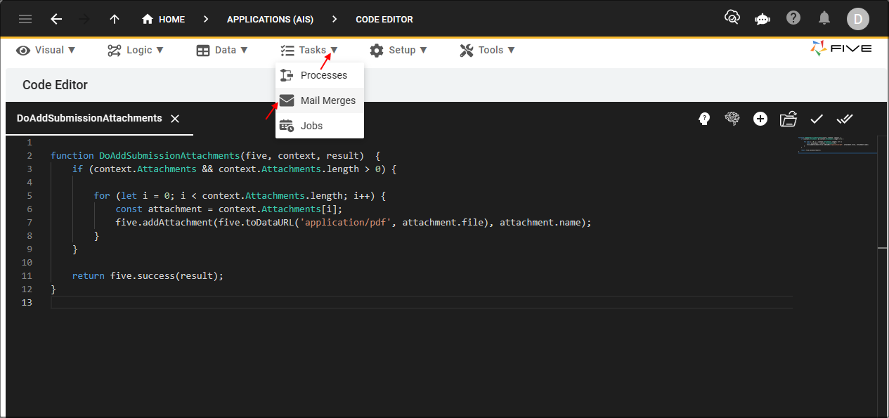 needs to be attached to the Do Merge Record event on the Submission Received mail merge and will merge the attached